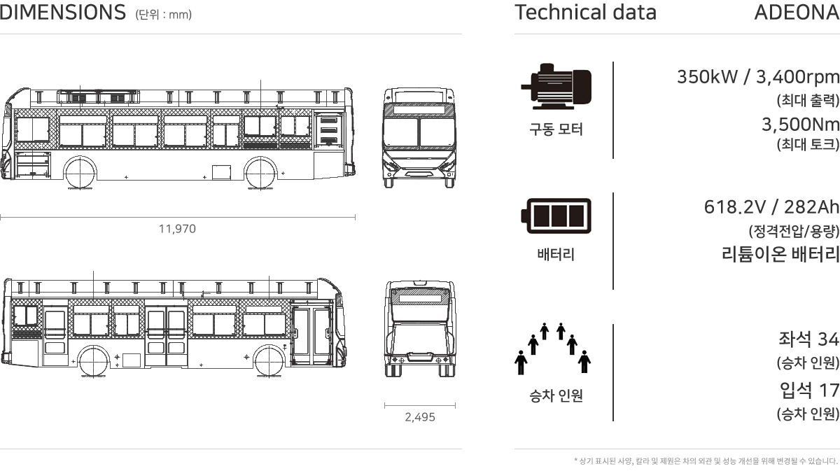 3도어를 적용하여 출입구에서 생기는 승객들의 불편함을 최소화 하였으며 환경과 소음공해를 주지 않는 친환경 전기버스 입니다.