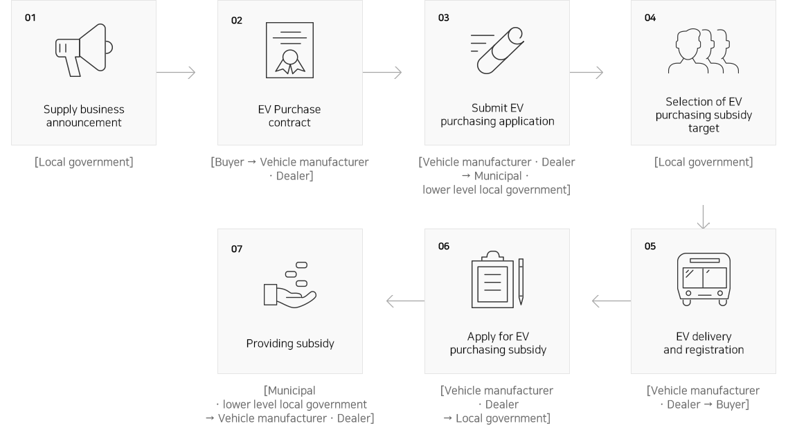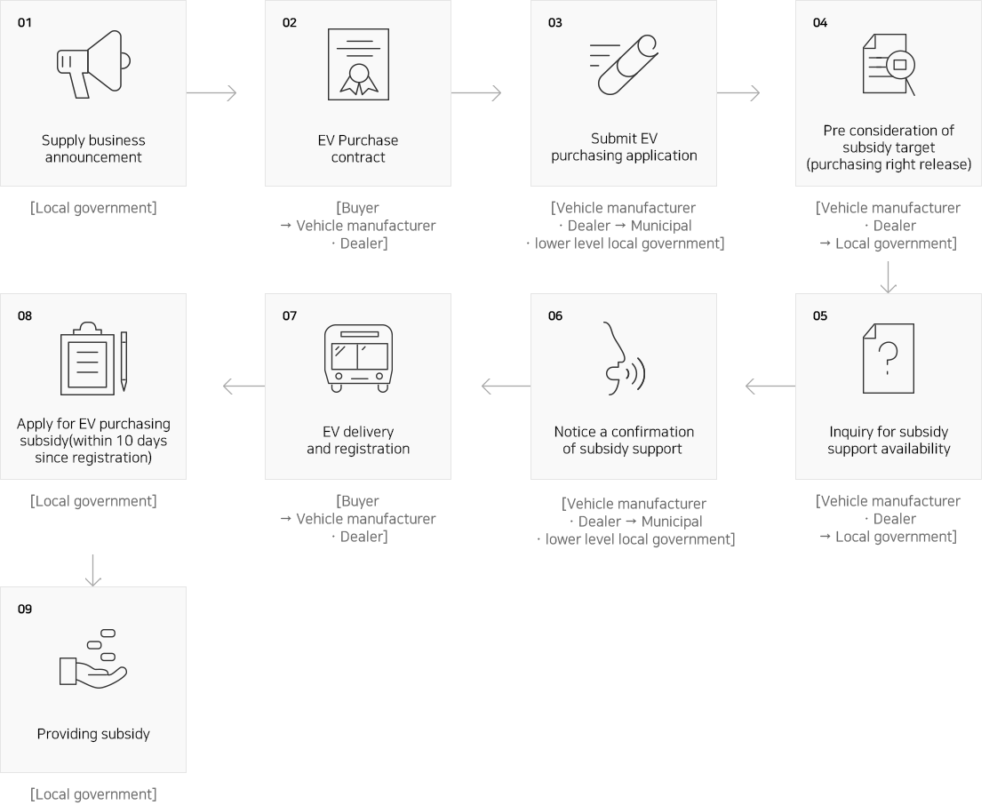 Buyer pays vehicle price except subsidy difference to the manufacturerㆍdealer and local government (Central governmental + local governmental subsidy) or KECO (Central governmental subsidy) pays subsidy to the manufacturerㆍdealer.